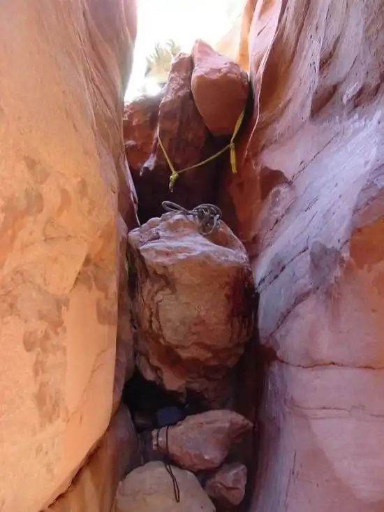 Перед вами тот самый камень, который в мае 2003 года прижал руку американского альпиниста Арона Ли Ралстона (Aron Lee Ralston). Чтобы выбраться из западни Арон самостоятельно ампутировал себе кисть правой руки, используя для этого тупой нож. Эта история невероятного спасения легла в основу фильма "127 часов".