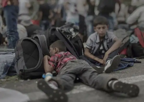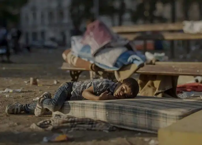 Семилетний Ахмад спит на тротуаре на границе между Венгрией и Австрией. Мальчик был ранен осколком в голову, когда снаряд попал в дом его семьи в городе Идлиб, а его младший брат погиб. С тех пор, как семья Ахмада бежала из Сирии, им приходится спать на автобусных остановках, на дорогах и в лесу.