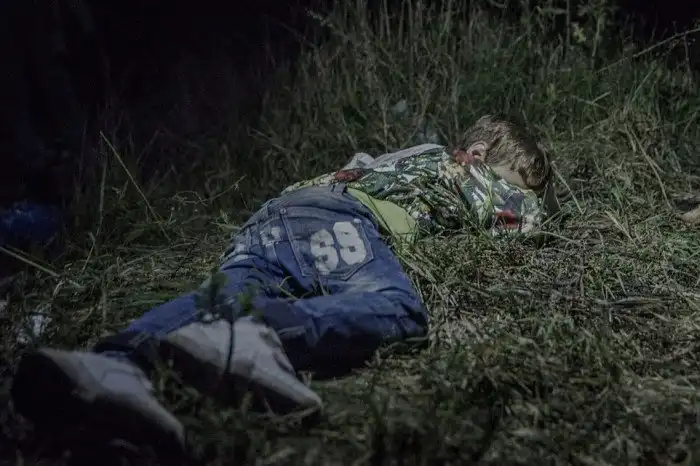 Шестилетний Ахмед спит на траве в Хоргоше, Сербия. Мальчик сам несёт свои вещи, пока его семья пешком идёт в Европу. Ахмеда взял на попечение его дядя, после того, как отец мальчика погиб в их родном городе Дайр-эз-Заур на севере Сирии.
