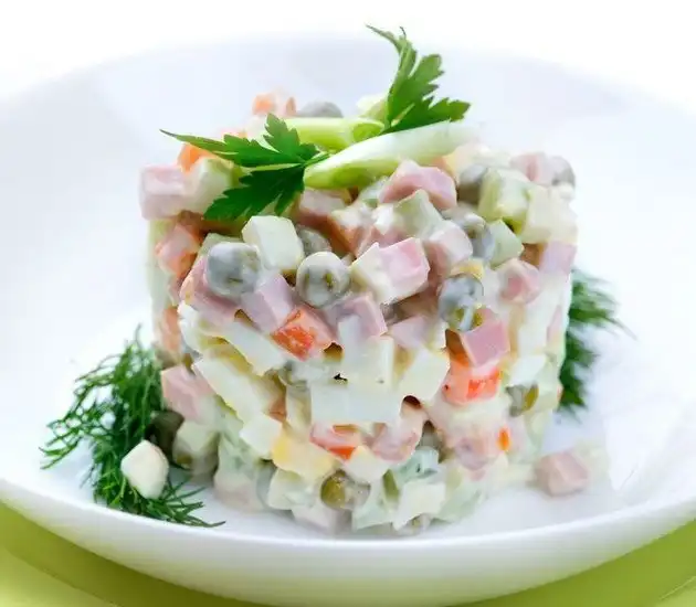 Советский вариант салата сильно отличался от дореволюционного. Он был настолько «по мотивам», что его вполне можно назвать и пародией. Ни тебе рябчиков, ни паюсной икры, ни раков…