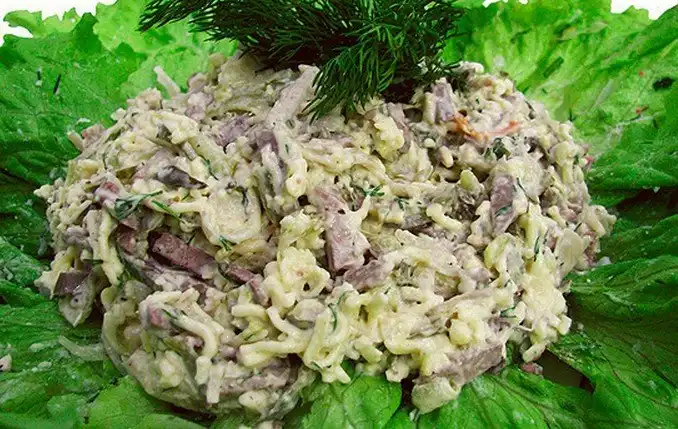 Как приготовить. В салате всего три основных продукта, плюс неизменная заправка – майонез. Делали его из говяжьей печени, которую сначала обжаривали крупными кусочками, а затем нарезали соломкой. Соленые огурчики нарезали таким же способом. Лук, нашинкованный полукольцами, пассировали. Затем все это перемешивали, солили, перчили и добавляли волшебный «Провансаль». На полкилограмма печени уходило столько же лука и вполовину меньше огурчиков.