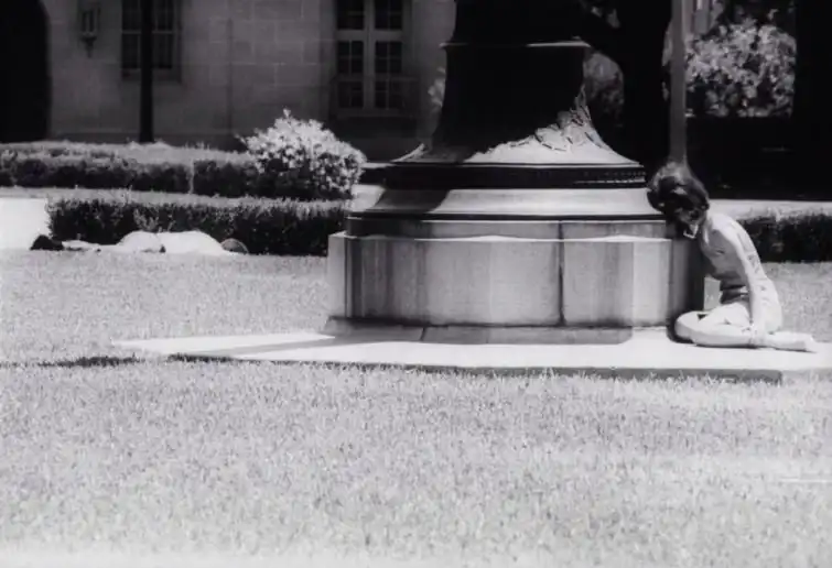 Девушка прячется за статуей, в нескольких метрах от неё лежит раненый снайпером Чарльзом Уитманом человек. Уитмен забаррикадировался на самом верху 27-этажной башни Техасского университета и в течение полутора часов стрелял из винтовки с оптическим прицелом по людям на улице. В ходе обстрела Уитменом было убито 16 и ранено 32 человека. США, Техас, Остин, 1 августа 1966 года