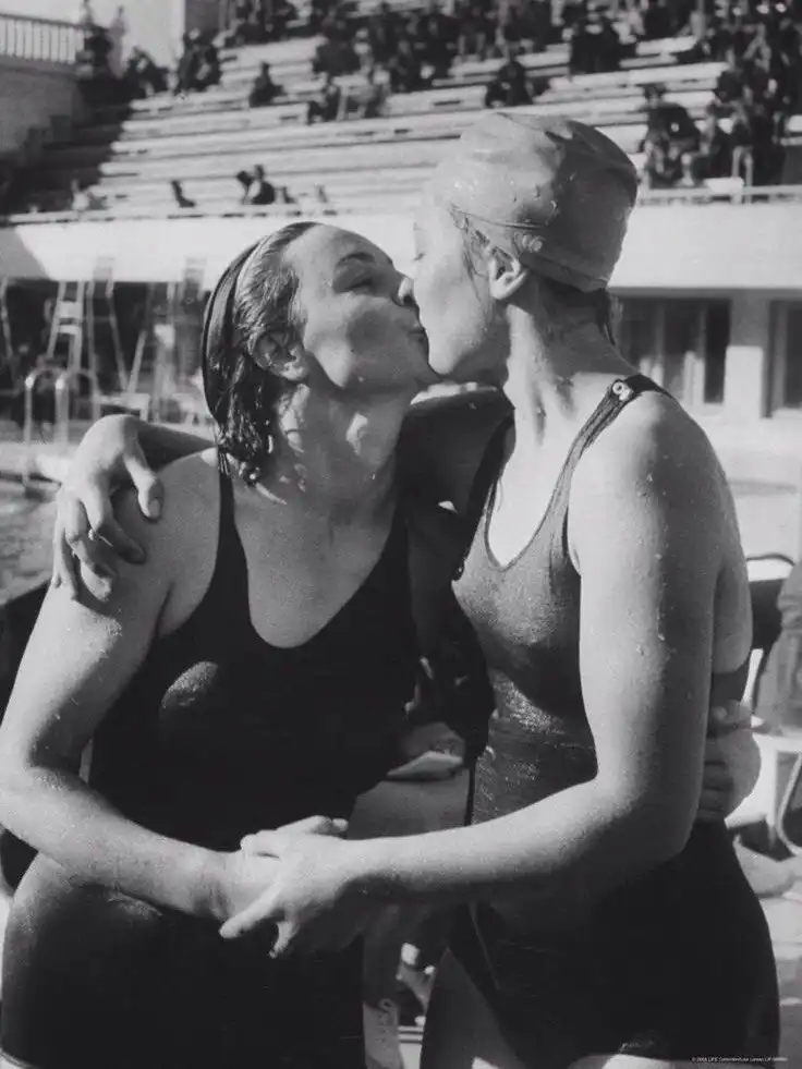 Мария Гавриш (слева) поздравляет Елену Коваленко, которая победила ее во время соревнования по плаванию брассом на Спартакиаде народов СССР в Москве, 1956 год