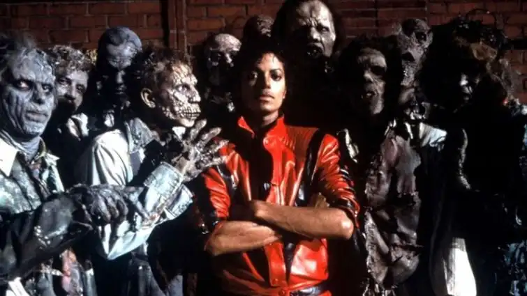 Майкл Джексон с массовкой на съёмках клипа "Thriller", 1983 год