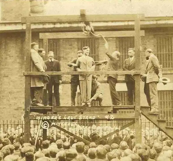 Американский гангстер Чарли Биргер улыбается перед казнью. Последние его слова были: "Это прекрасный мир!". Бентон, штат Иллинойс, 19 апреля 1928 года