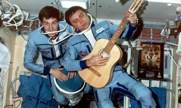Советские космонавты Сергей Крикалев и Александр Волков на космической станции "Мир", 1989 год