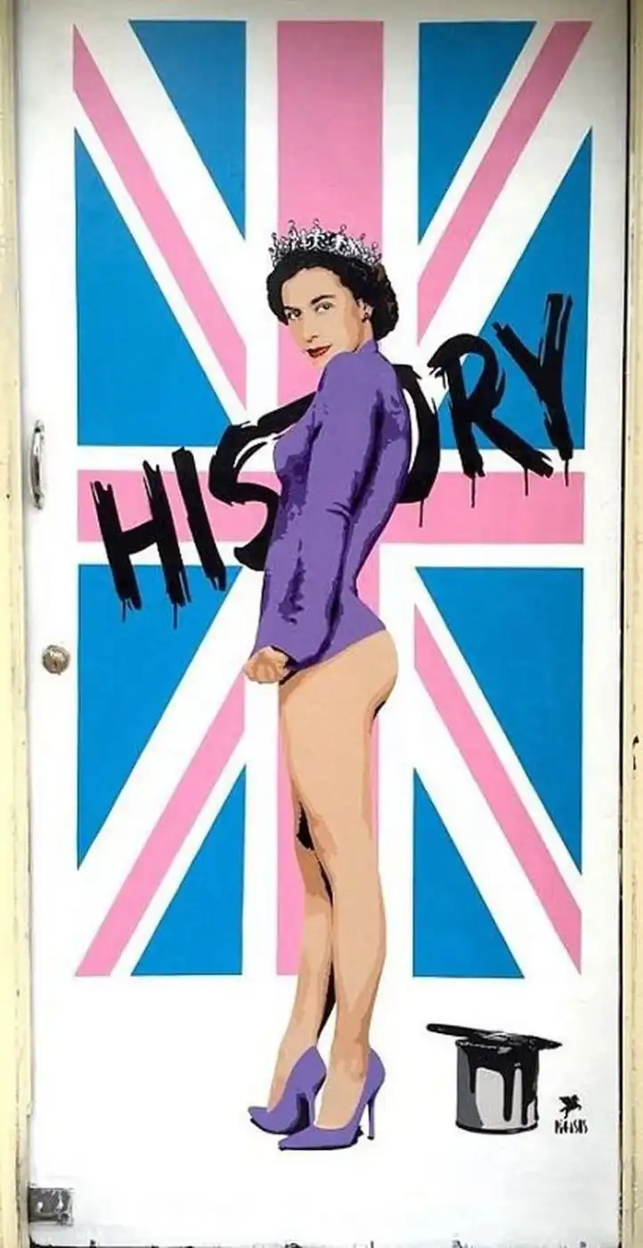 К 63-летию пребывания королевы Елизаветы II на престоле уличный художник изобразил её на дверях паба