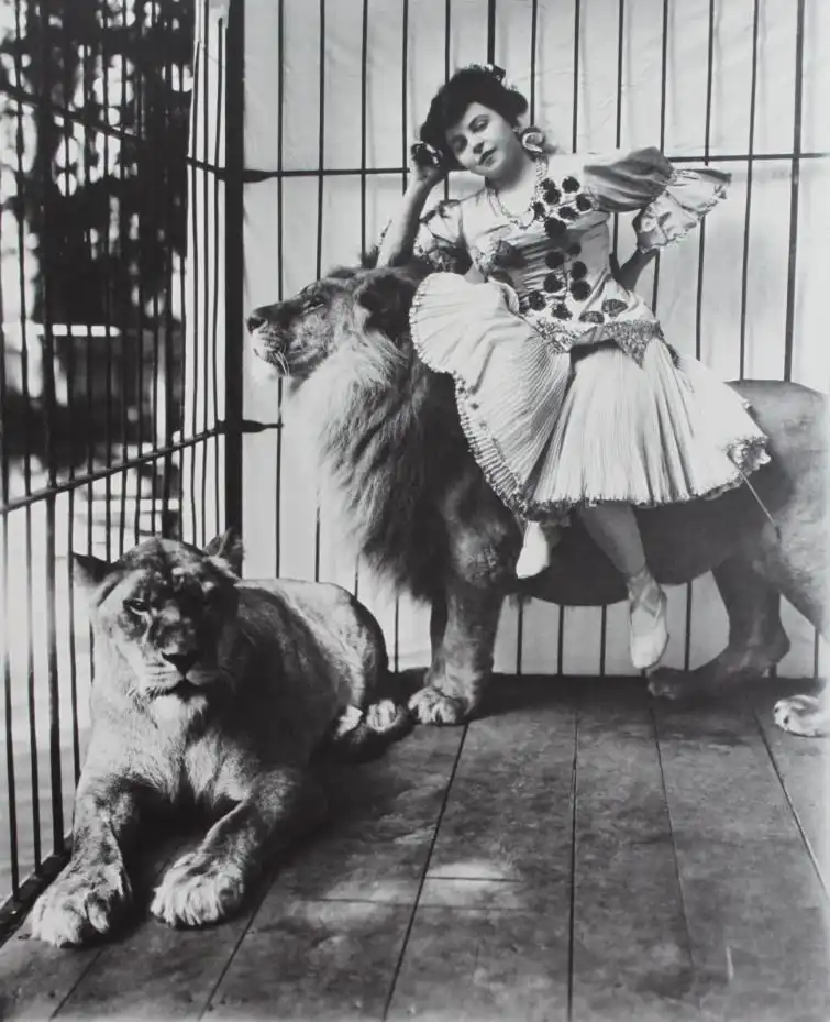 Американская дрессировщица мадемуазель Шиль вместе со своими львами, 1905 год