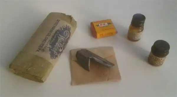 Слева 12 листов туалетной бумаги, рядом консервный нож. В верхней части находится жевательная резинка. Рядом 12 таблеток для очистки воды Halazone и 4 таблетки соли.