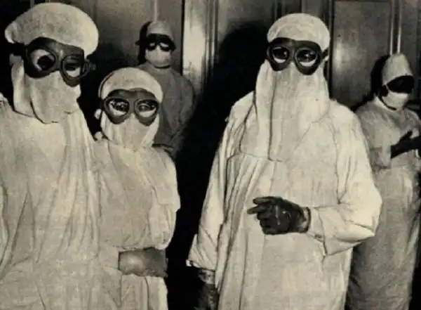 Врачи в защитной одежде во время эпидемии оспы в Вроцлаве. Польша, 20 июля 1963 года