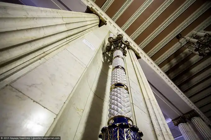 Полумрак в храме науке. Научные «божества»: Менделеев, Жуковский, акад. Павлов, Мичурин. Зал похож на храм Зевса в Олимпии.