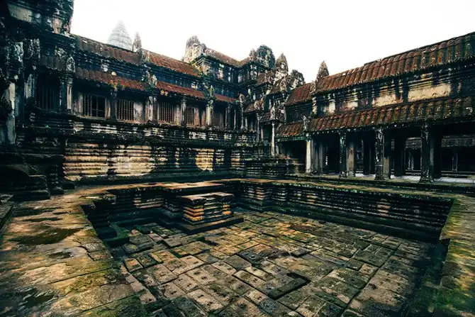 Гигантский индуистский храмовый комплекс Ангкор-Ват в Камбодже, посвящённый богу Вишну. Является одним из крупнейших из когда-либо созданных культовых сооружений и одним из важнейших археологических памятников мира. В XV веке перестал использоваться и был заброшен. Открыт для европейской цивилизации в 1860 году. (Фото Alex Teuscher):