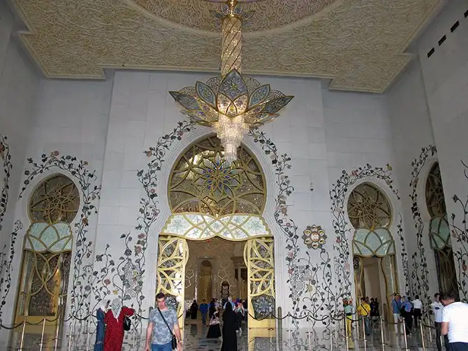 Её стены инкрустированы чистым золотом и самоцветами. Все залы в мечети Шейха Зайда украшены множеством редких и красивых драгоценных и полудрагоценных камней и перламутром, а колонны, полы и арки оформлены так, будто по ним вьются цветущие лозы.