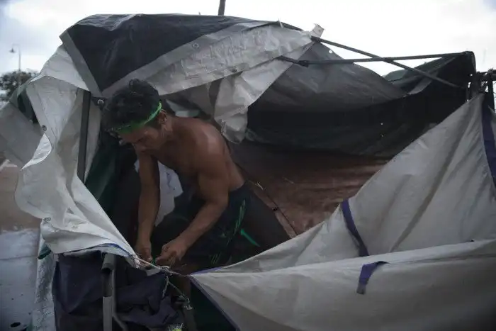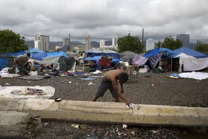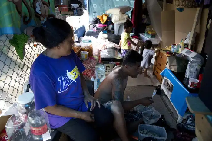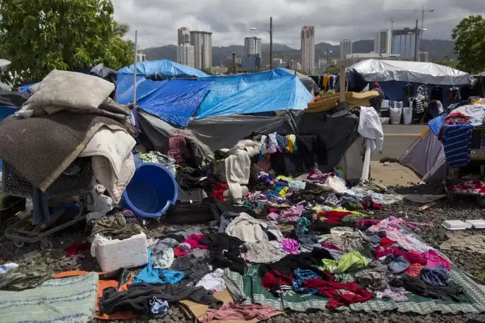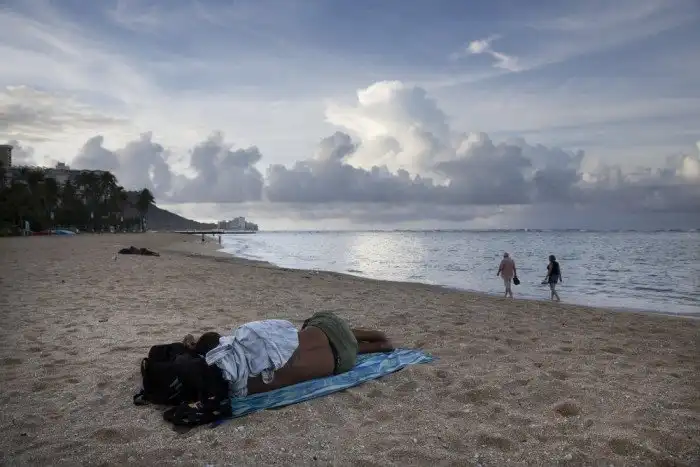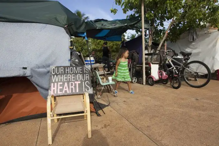 По количеству бездомных Гавайи опережают такие штаты США, как Невада и Нью-Йорк. Число людей без крыши над головой стремительно увеличивается в последнее время и сейчас на каждые 100 тысяч населения приходится 487 бездомных. Далее предлагаем вашему вниманию подборку снимков, которые расскажут о жизни этих несчастных людей на гавайских улицах, пляжах, в импровизированных лагерях и социальных приютах.