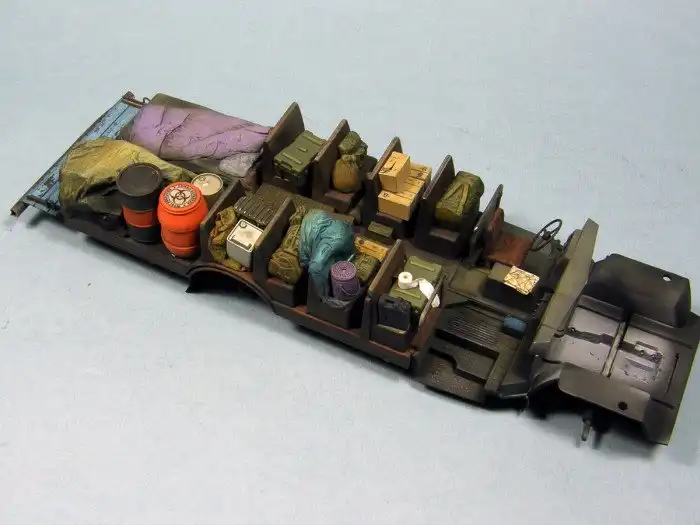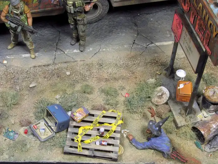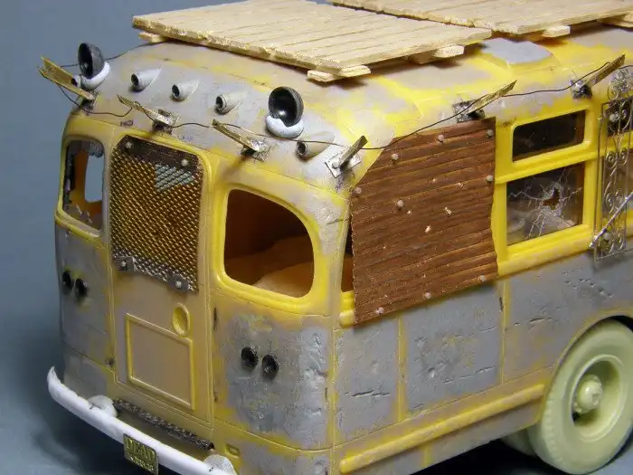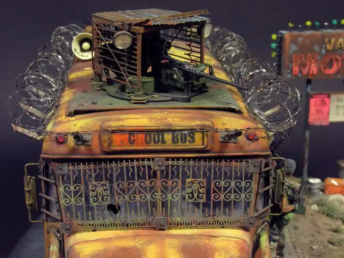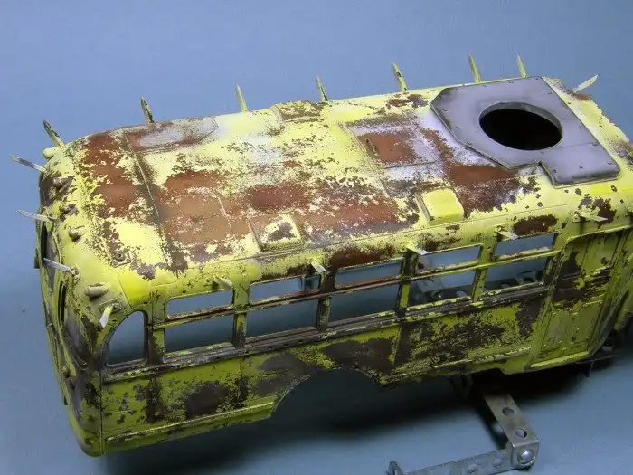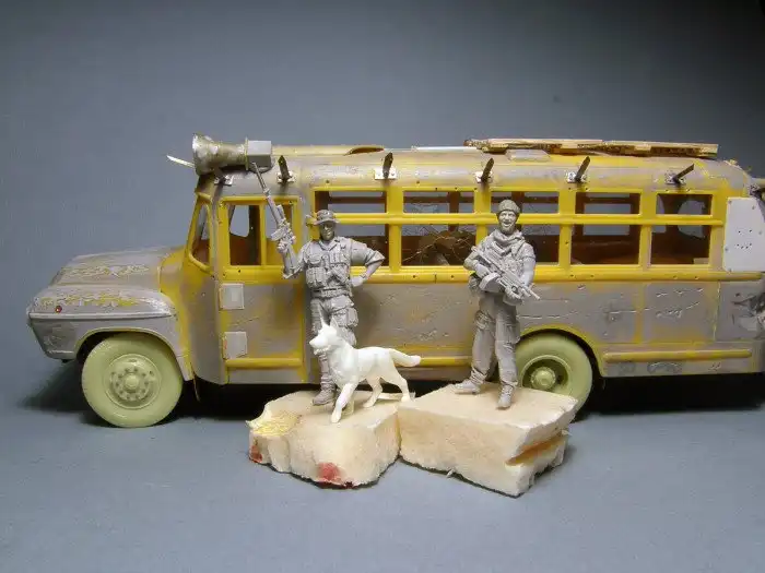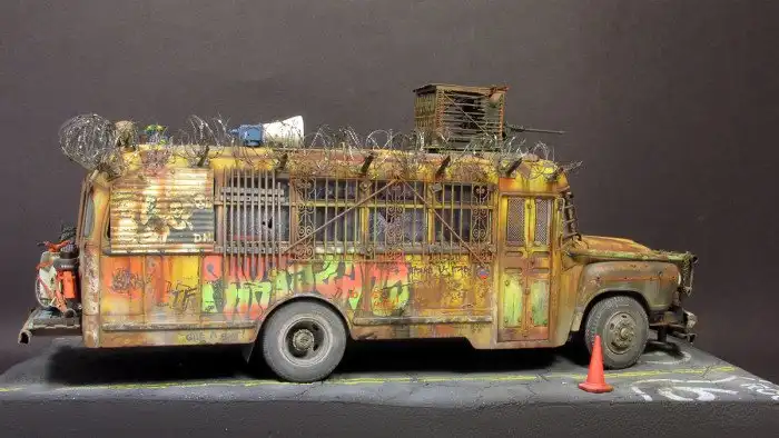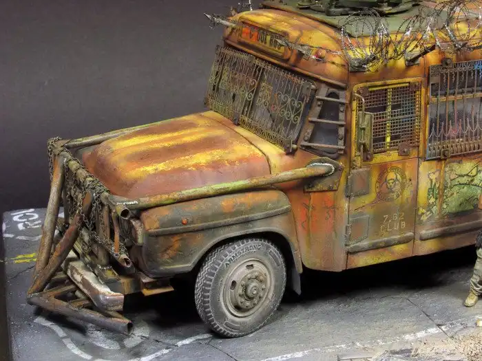 Большинство диорам, которые мы вам показывали, были посвящены Второй мировой войне, однако, сегодняшняя диорама посвящена зомби-апокалипсису и изображает зомби-автобус. Как собиралась эта диорама смотрим далее.