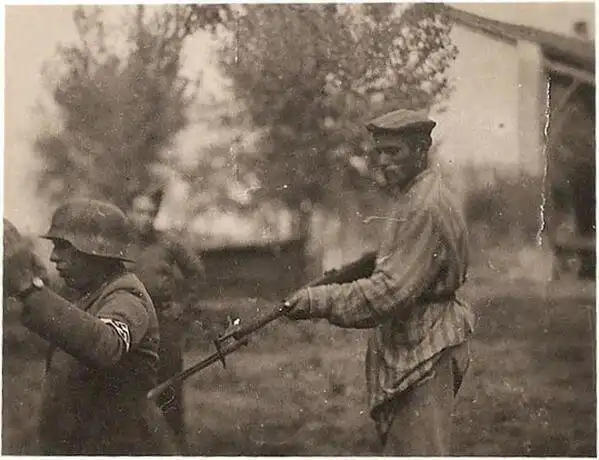 Освобожденный еврей держит немецкого солдата, угрожая оружием, 1945 год