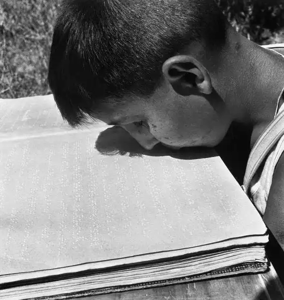 Слепой мальчик, который потерял руки во время войны научился читать губами. Рим. Итальянская Республика. 1948 год