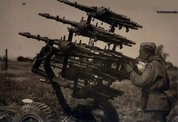 Трофейная немецкая зенитная установка в руках солдата РККА. 1944 год
