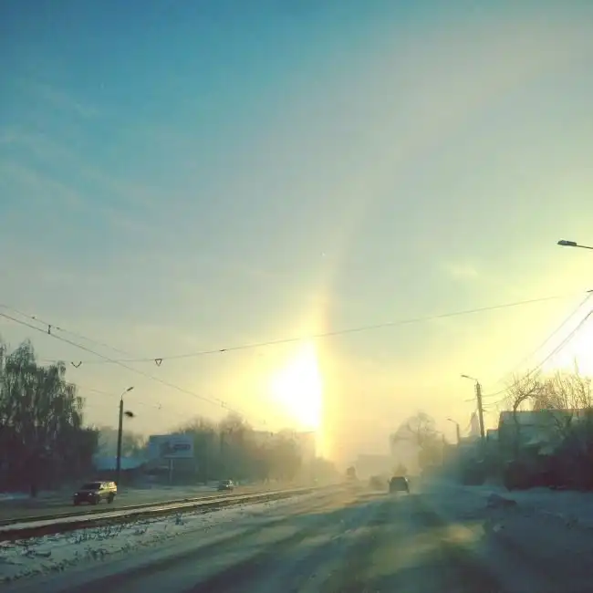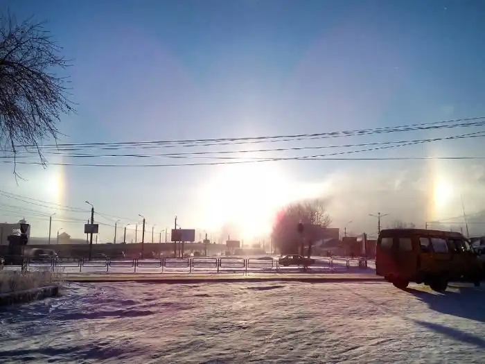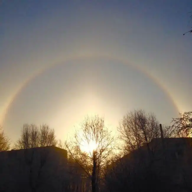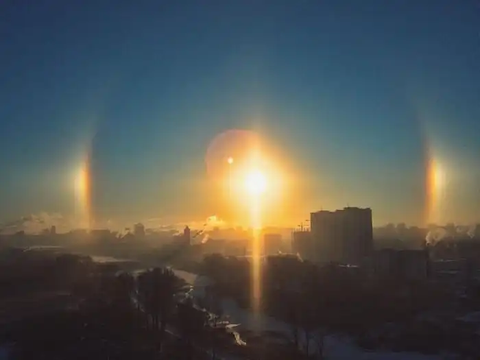 В течение нескольких последних дней жители Челябинска и других городов Урала имеют возможность наблюдать великолепное оптическое явление - гало. Вокруг небесного светила образуется кольцо, при котором можно видеть «ледяную радугу» или сразу три светила, как в данном случае. Это явление наблюдается во время формирования ледяных кристаллов в перистых облаках в холодную солнечную погоду.