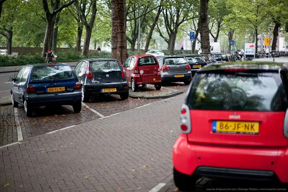 Классическая европейская парковка. Больших автомобилей в Амстердаме нет в принципе, потому что зачем? Улице довольно узкие, много пешеходов и велосипедистов. Здесь главное — компактность и экономность транспорта.