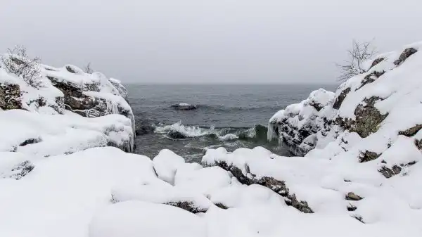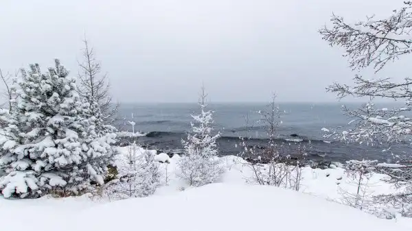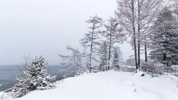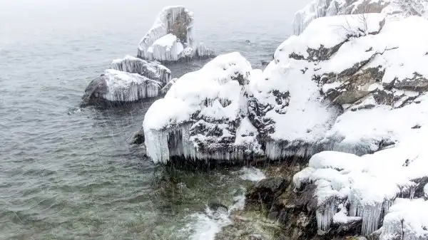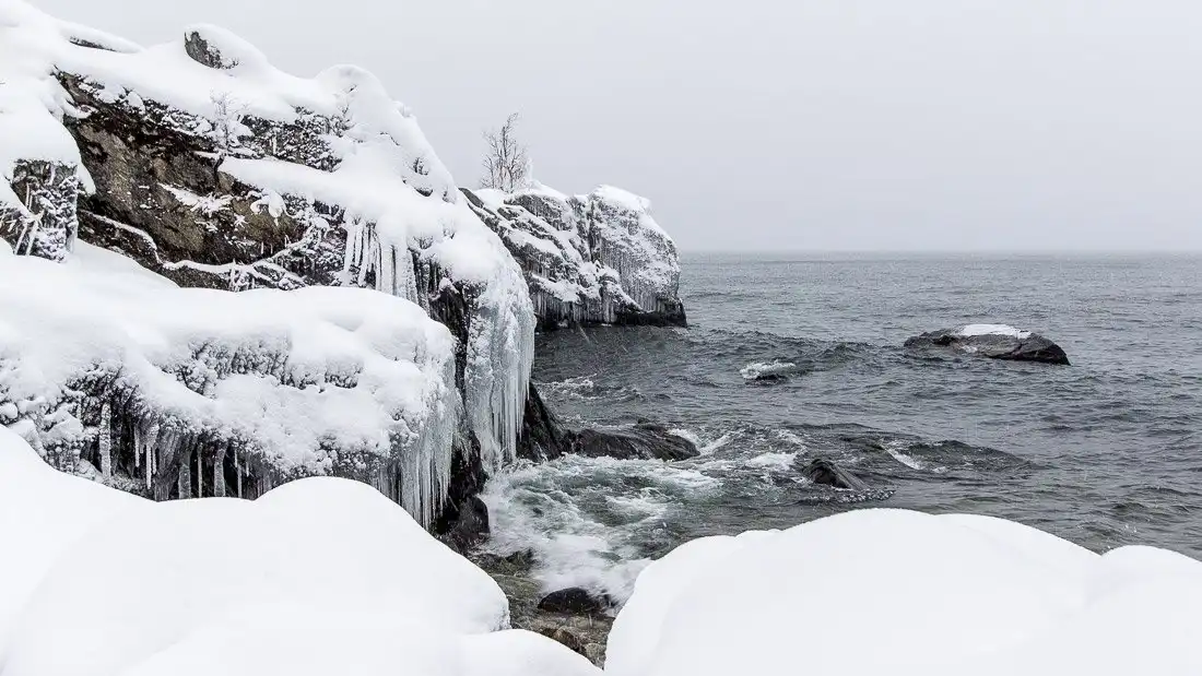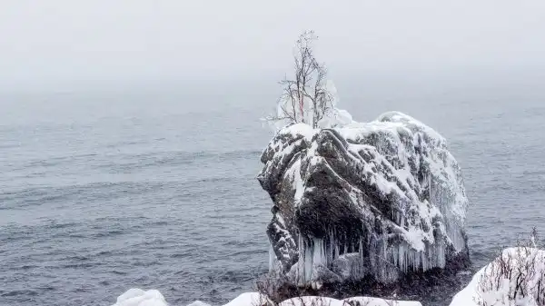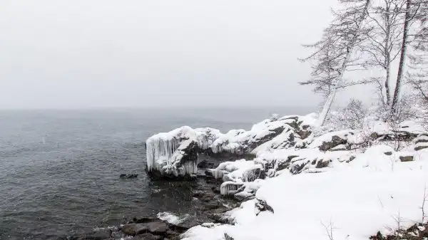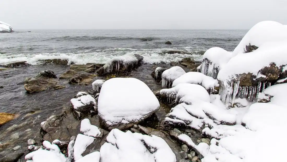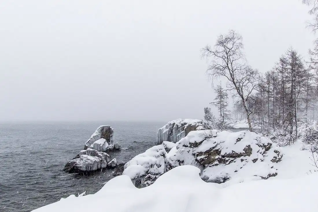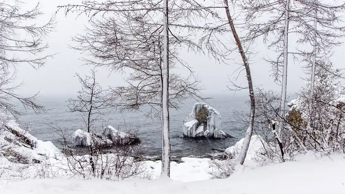 Ноябрь славен на Байкале штормами, волны разбиваются о скалы и камни, отходят, оставляя наледи и сосульки. На замёрзших деревцах, тех которые близко на берегу, позвякивают обледенелые веточки.
