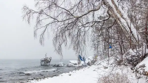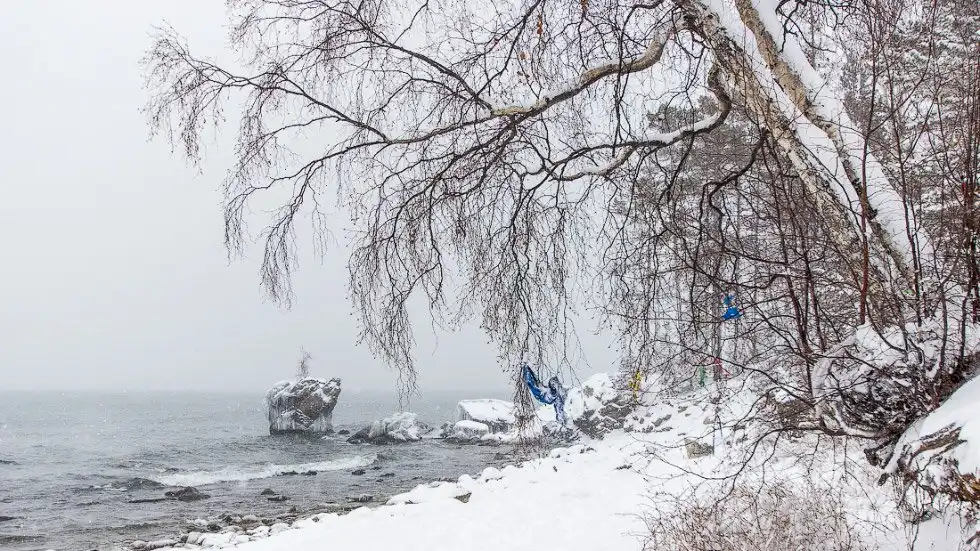 На Байкал, в район Турки мы приехали часа в три. В Кике — солнце, а тут — темень и снег. Природа стала почти монохромной, лишь цветные тряпочки повязанные на деревьях по местному недавнему обычаю, резко выделяются на этом фоне. Но кажется мне они тут лишние.