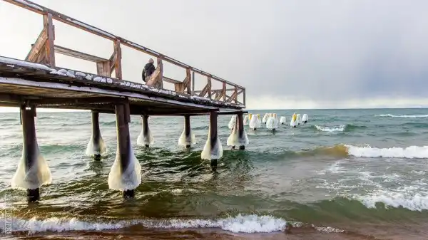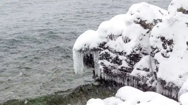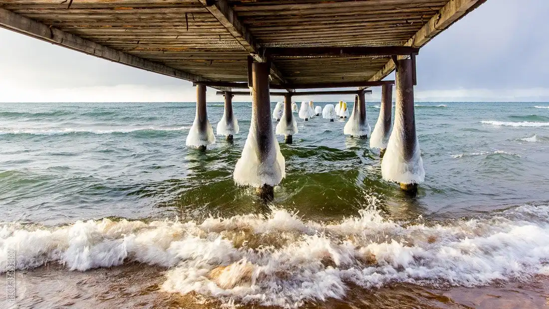 Посмотрите на нижнюю границу сосулек. Вода пока сравнительно тёплая и не даёт им опускаться ниже уровня волн.
