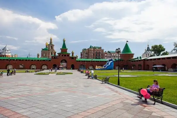 Молодая мама закрывает глаза ребёнку, чтобы не травмировать его детскую психику ужасающим видом разрушенного путинским режимом города. Йошкар-Ола, 2015 г.
