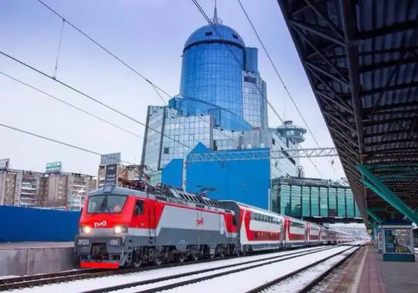 Российская действительность — на фоне полуразрушенного вокзала стоит ржавый поезд с еще советскими вагонами. Самара, 2015 год