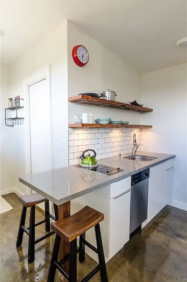 Прямо у входа находится санузел со стиральной машиной и сушилкой. Сразу за ним — комната-студия с полностью оборудованной кухней, гостиной зоной с диваном и телевизором, а также двухспальной кроватью на возвышении в дальнем конце. Пространство под кроватью и лестницей используется в качестве места для хранения вещей. Жилище прекрасно освещено, благодаря окну по всей длине комнаты.