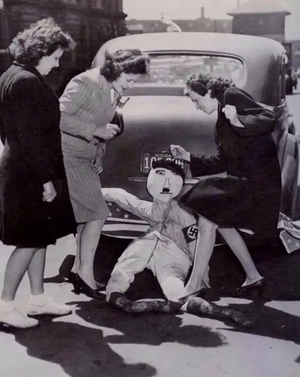 Женщины избивают ногами чучело Гитлера, США, 8 мая 1945 года
