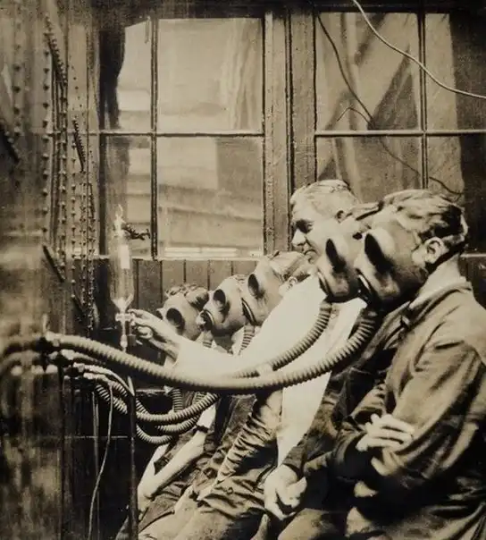 Работа людей на этой фотографии заключалась в вдыхание ядовитых газов для проверки противогазов на безопасность.