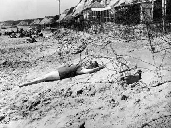 Женщина загорает в военное время в окружении колючей проволоки на пляже в Борнмуте, 1944 г.