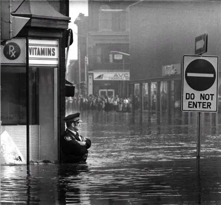 Канадский офицер охраняет аптеку от разграбления во время наводнения, 1974 г.