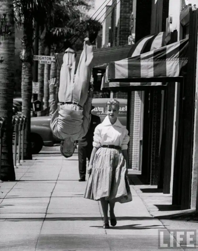 Акробат и актер Расс Тэмблин делает сальто во время прогулки с актрисой Венецией Стивенсон, 1955 г.