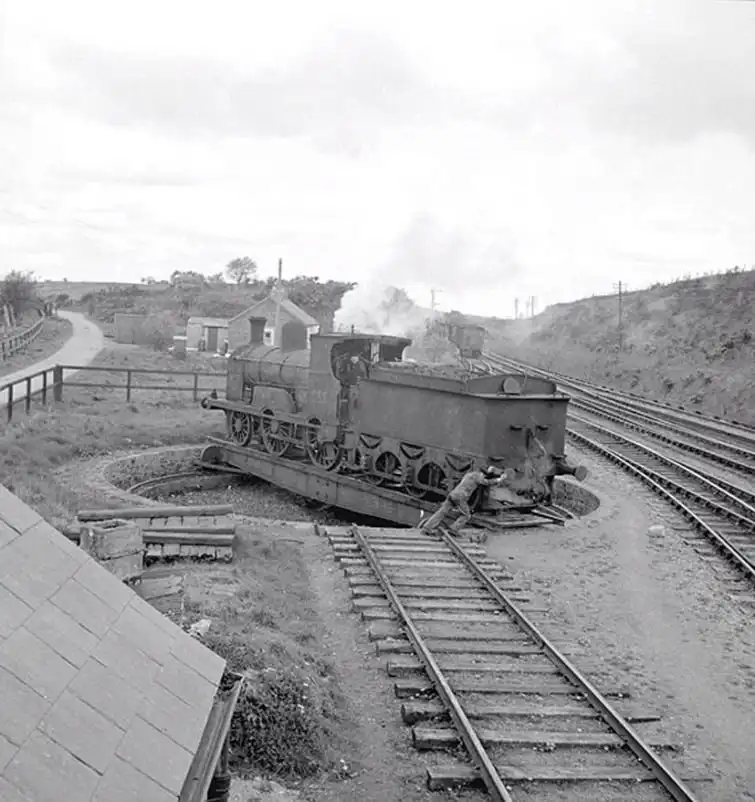 Рабочий разворачивает платформу с паровозом, Ирландия, 1960 год.