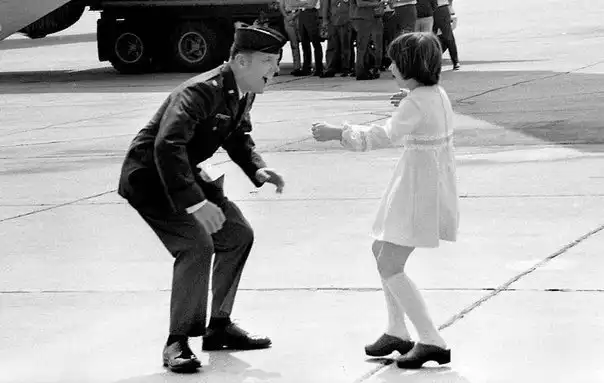 Майор ВВС Джей Гесс возвращается с войны. Гесс был в плену в Северном Вьетнаме более пяти лет, его его бомбардировщик F–105 был сбит вражеским огнем. Встреча с девятилетней дочерью, 17 марта 1973 года.