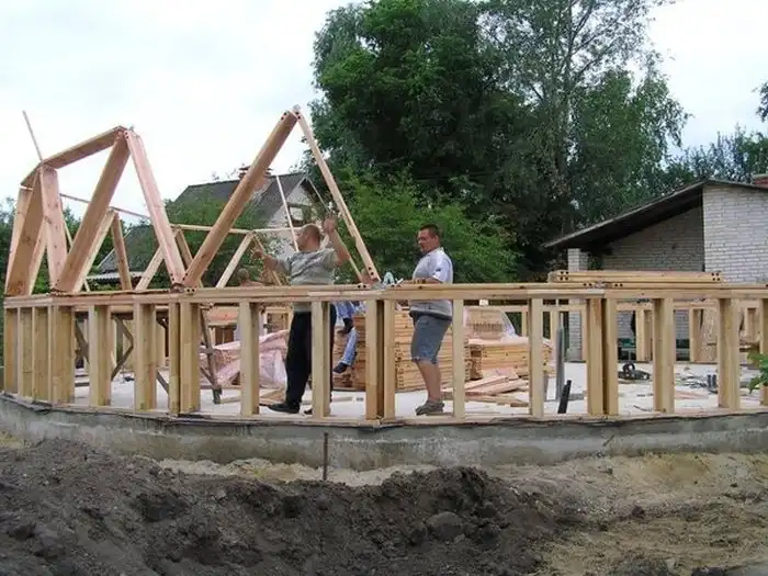 Монтаж вертикальной стены. Конструктор рассчитал фундамент таким образом, чтобы он выступал относительно внешней стороны каркаса на 5 см. Я согласился а потом пожалел, возникли сложности с утеплением цоколя.