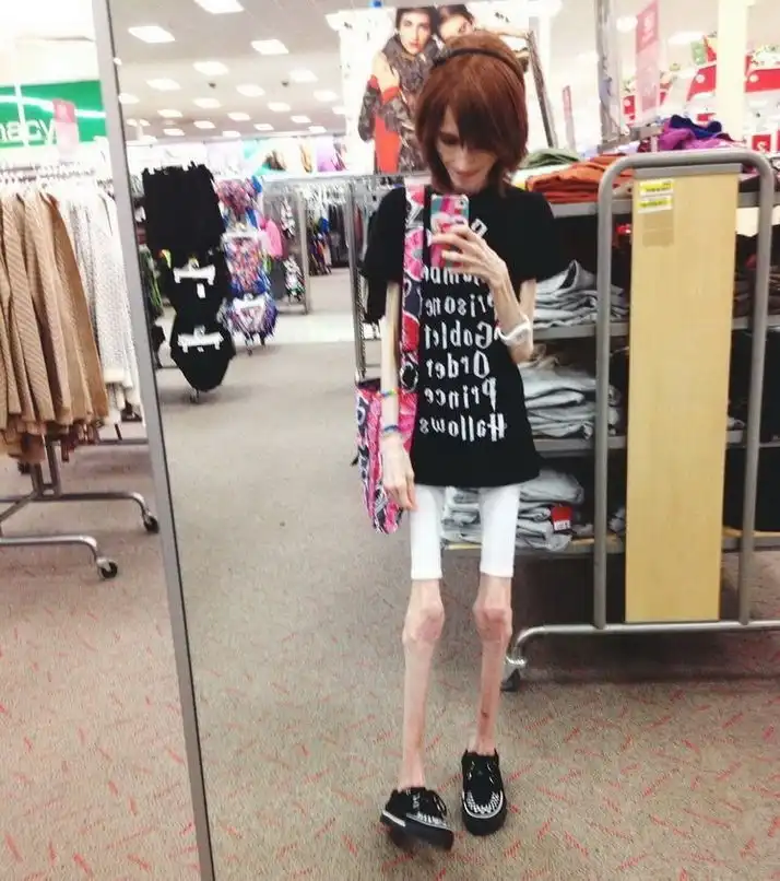 Немало перевидал анорексичек, но эта девушка переплюнула их всех. Раньше была нормальной девчушкой, а сейчас превратилась в ходячий скелет. В прямом смысле слова. Одежду покупает в детских магазинах, судя по всему. Куда смотрят родители?