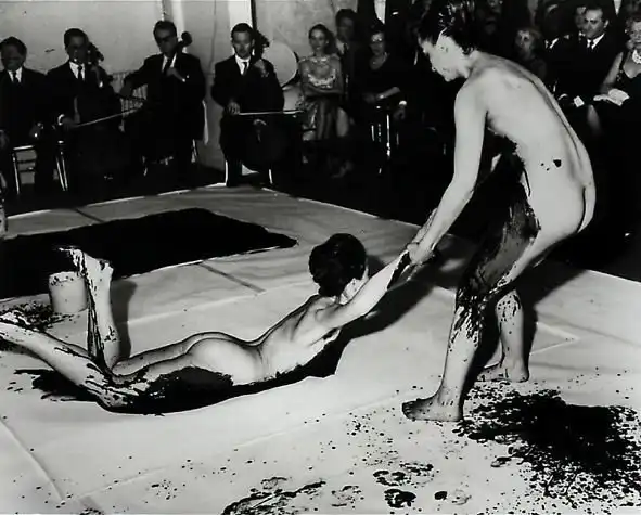 Ив Кляйн во время изготовления "произведения" Anthropométries de l’Epoque bleue ("Антропометрия голубого периода"); Франция, 1960 г