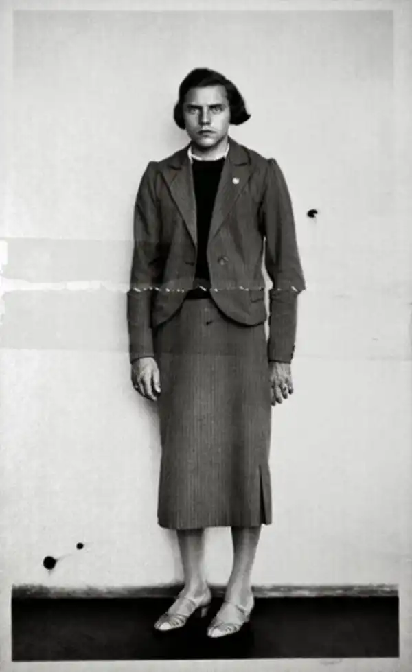 Дора Ратхен, спортсменка олимпийской сборной Германии, арестованная на железнодорожной станции по подозрению в том, что была мужчиной, переодетый в женское платье, 1938