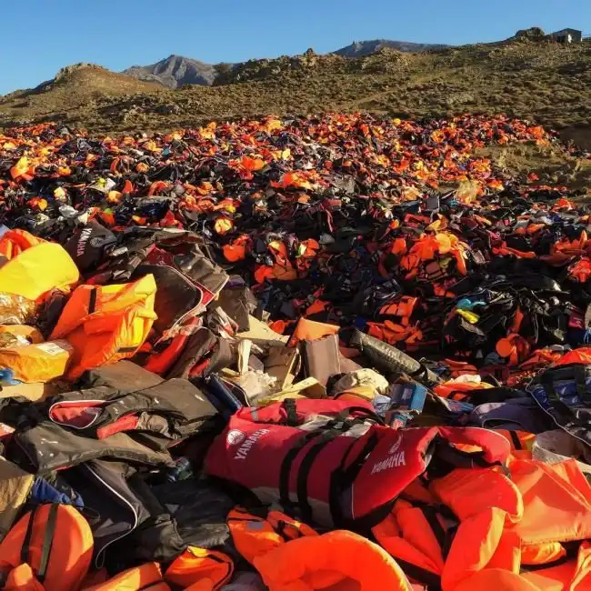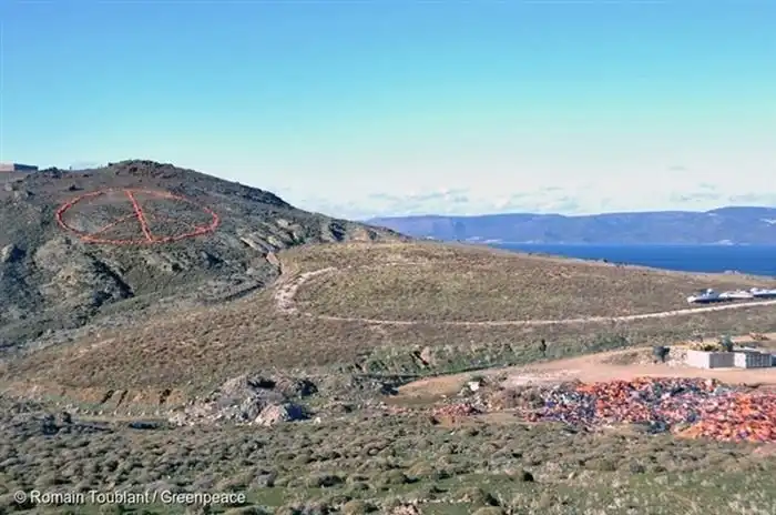 1 января на греческом острове Лесбос собрались волонтеры и представители различных гуманитарных организаций, в том числе «Врачи без границ» и Greenpeace, которые соорудили огромную инсталляцию на склоне одного из холмов у деревни Моливос. Из более чем 3000 спасательных жилетов, брошенных здесь беженцами, был составлен гигантский символ мира. Инсталляция составлена в память о тех, кто не сумел добраться до заветного берега, а также является напоминанием о том, на какой риск идут мигранты, бегущие от войн и нищеты в своих странах. Согласно последним данным, за последний год в Европу по Средиземному морю прибыло более миллиона беженцев, при этом, по меньшей мере, 3700 человек так утонули.