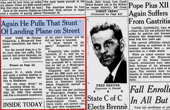 Через два года, 4 октября 1958 года, Томми снова культурно отдыхал в баре. Естественно, речь зашла о его полете, как–никак, годовщина! Но тут этот чертов бармен позволил себе усомниться! Он, видите ли, не верит, что самолет может сесть на улицу! Он, видите ли, сомневается, что Томми говорит правду!