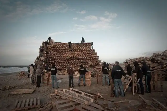 В некоторых городах Нидерландов сохранилась старая традиция жечь огромные костры в новогоднюю ночь. Для этого специально сооружают высокие башни из старых ящиков, паллетов и поддонов, которые потом поджигают. Подобные зрелища стали коммерчески выгодными, так как на них приезжают посмотреть туристы и даже есть спонсоры, размещающие на ящиках свою рекламы. Как проходит это праздничное действо, смотрим далее.