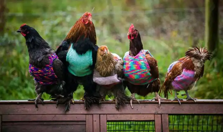 Две англичанки вяжут свитера для куриц, которых "отправили на пенсию". Курицы всю жизнь прожили в клетках и не могут уже приспособиться к погодным условиям