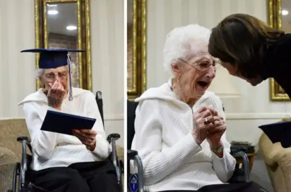 97-летняя женщина получает свой школьный аттестат. В свое время ей пришлось бросить школу, чтобы заботиться о своих братьях и сестрах и о матери, у которой обнаружили рак