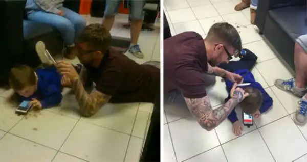 В принципе ничего удивительного, но все равно безумно трогательно - папа заботится, как бы его сын не промок во время ливня