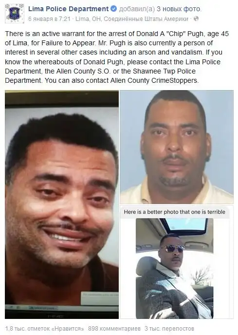 Весьма забавный случай произошел в городе Лайма, штат Огайо, США, где находящийся в розыске 45-летний преступник Дональд «Чип» Пью, посчитавший свое фото, сделанное ранее в полицейском участке неудачным, прислал полиции другую свою фотографию со словами «эта фотография лучше, чем та ужасная».