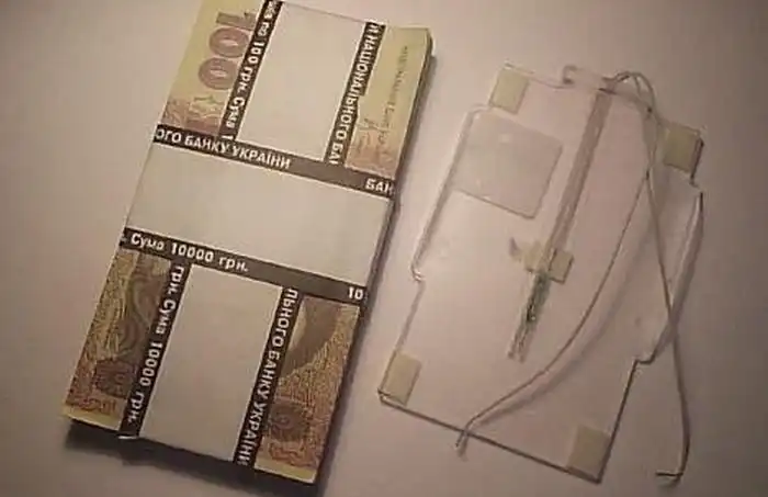На самом деле это муляж, хотя и не всегда (порой пачка может быть настоящей), только вот сдвинув ее с места кассир активирует тревожную кнопку.