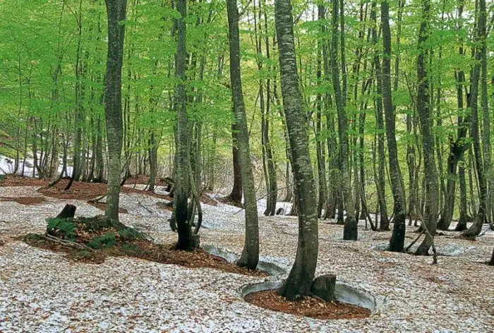 Горный заповедник площадью 1300 кв.км. располагается на севере японского острова Хонсю. На его территории произрастают кленовые, кедровые и сосновые леса, а также единственный значительный массив первозданных в Восточной Азии буковых лесов. 169,7 кв.км. территории объявлены памятником Всемирного наследия ЮНЕСКО.